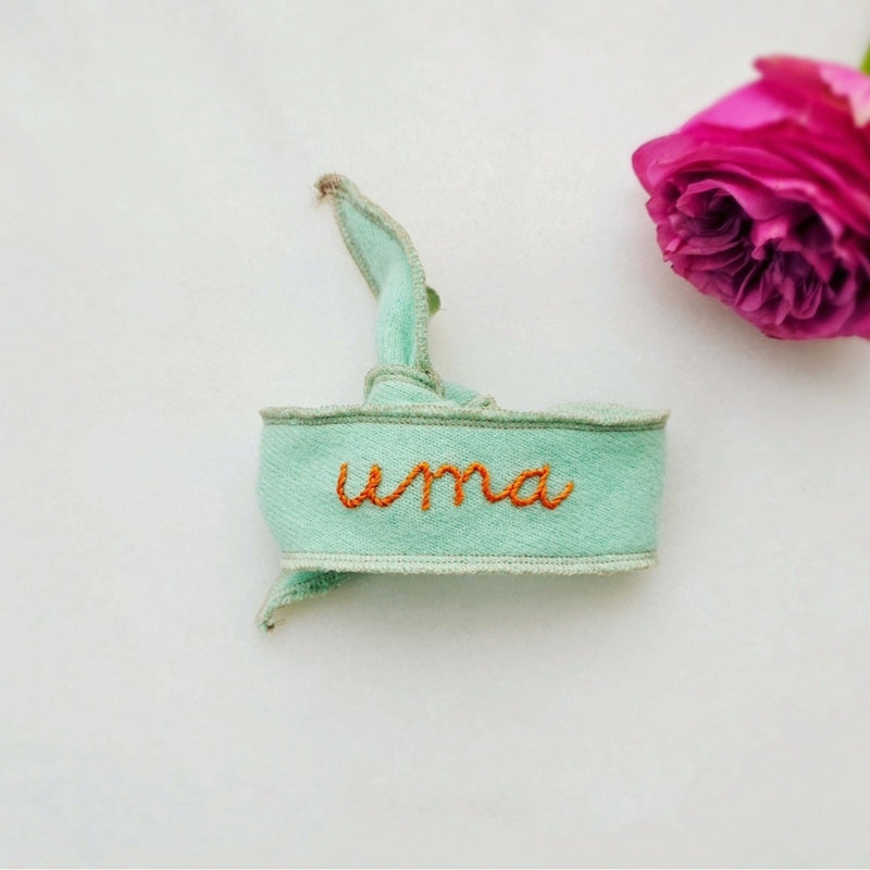 This custom knitwear collection is a little dog fashion favorite! Super soft, handmade scarf ties are made only with sustainable cashmere. Approximately 24" in length, they tie in a simple knot. Choose a style: single cashmere, double cashmere with embroidery, or cashmere-lined denim/fabric with pom-poms. Choose your colors for the fabric, thread and poms.